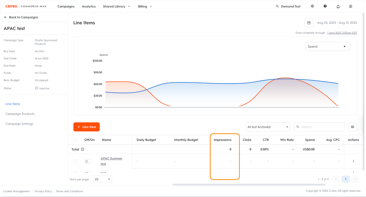On the line item dashboard, find the metric Impressions against your desired line item