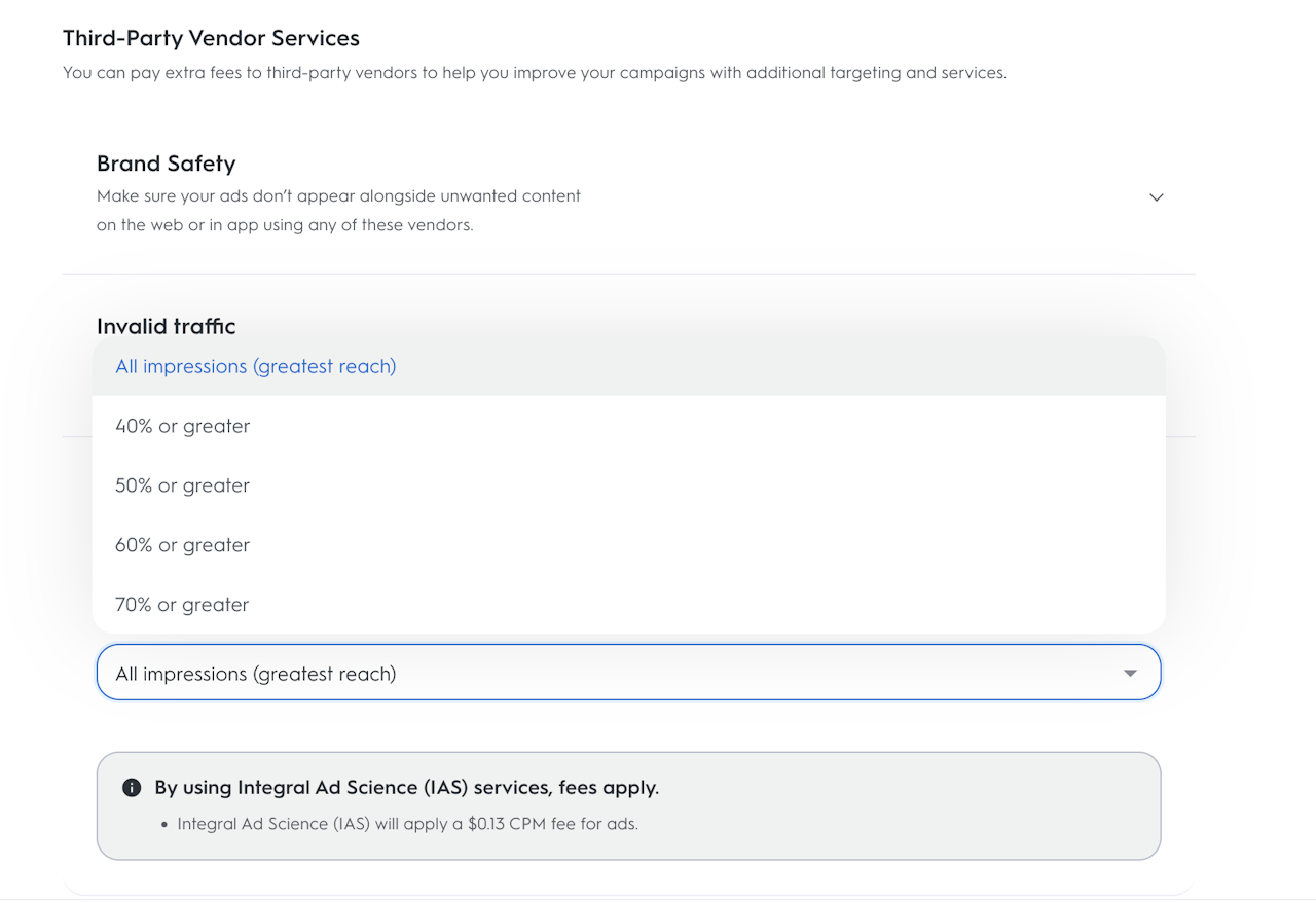 IAS offers IVT protection in Commerce Max to give your campaigns an added layer of security when running an Offsite campaign type. IVT Filters help protect your campaigns from bot traffic, non-human traffic, or ad fraud and will ensure your advertising dollars are being put to good efforts, and your KPIs are accurate.
