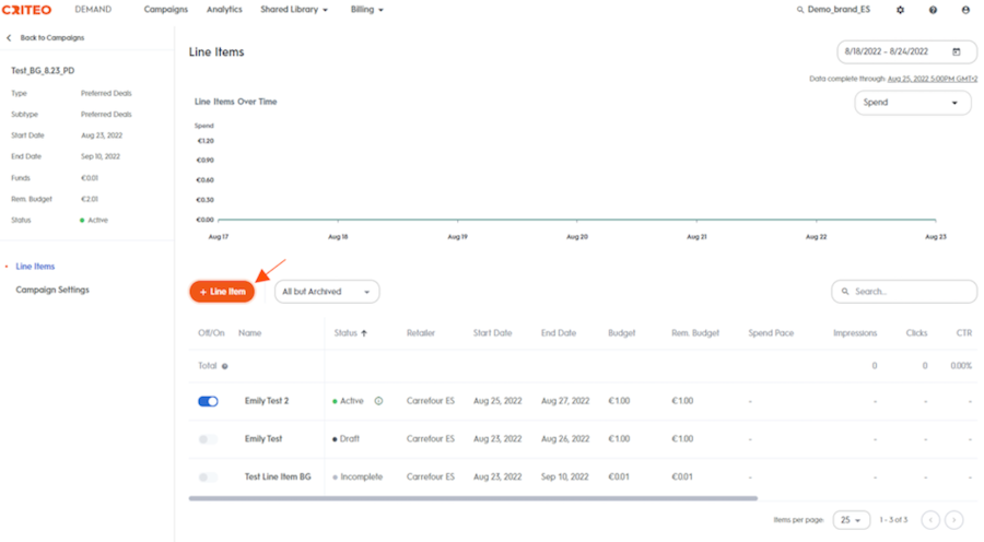 Navigate to the Campaigns dashboard and click on the name of the campaign to which you want to add a line item.