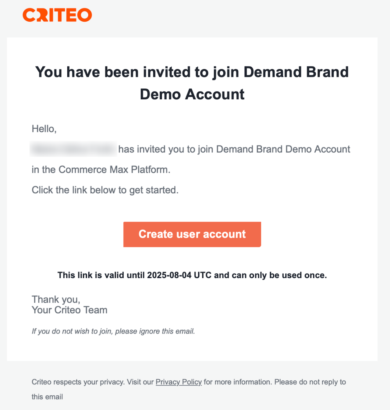 Once a new user has been added, they will need to create their user profile by following the instructions they have received via email from Criteo.