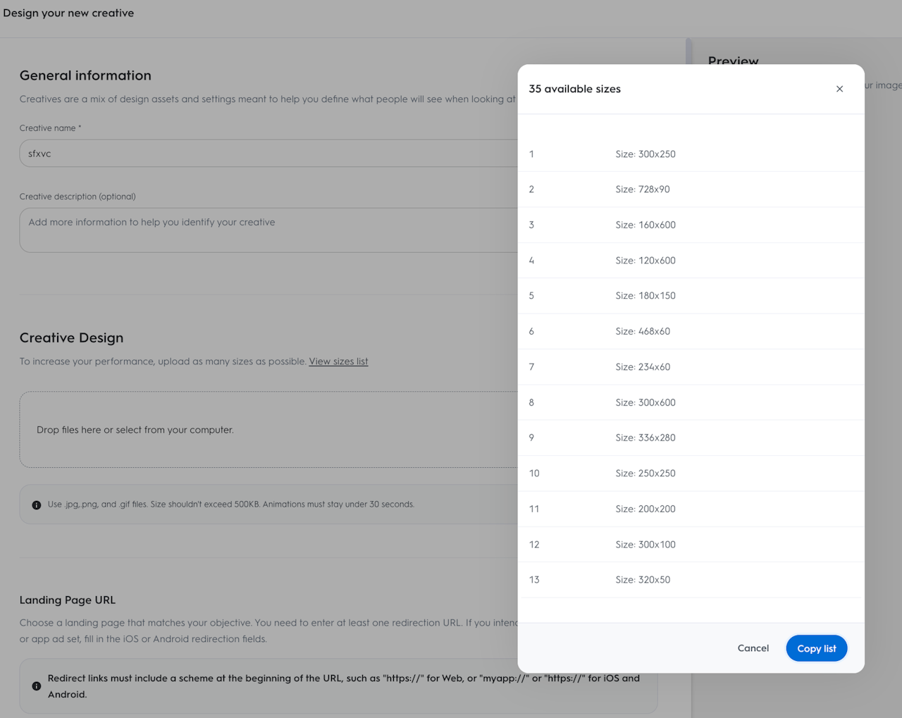 We accept MP4 files with a resolution of at least 720 pixels and a minimum 2500kbps bit rate. Videos can be up to 30 seconds. Criteo will generate multiple versions of the video file with various resolutions and bitrates to ensure maximum compatibility with users. | Impression Tracker (up to 10):