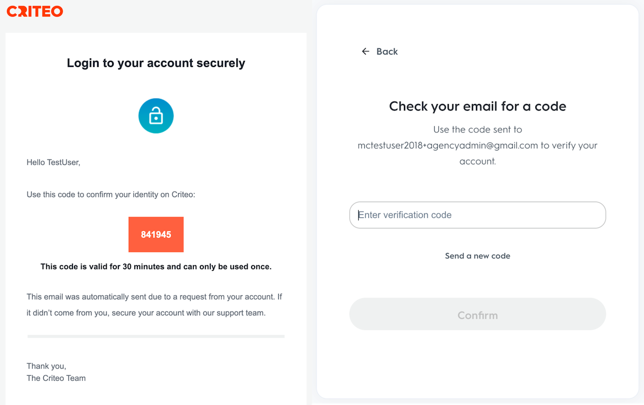 Multi-Factor Authentication is a layered approach to platform security. Criteo requires a user to present a combination of two credentials to verify their identity for login. MFA improves security because even if one credential becomes compromised, unauthorized users will be unable to meet the second authentication requirement and will not be able to access the platform.