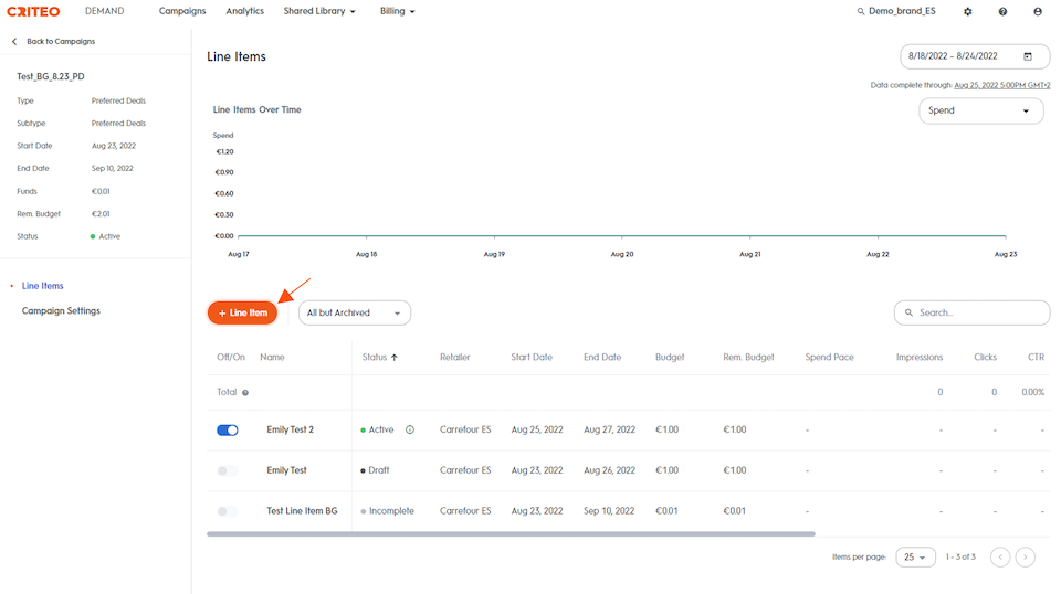 Click on the name of the campaign to which you want to add a line item.