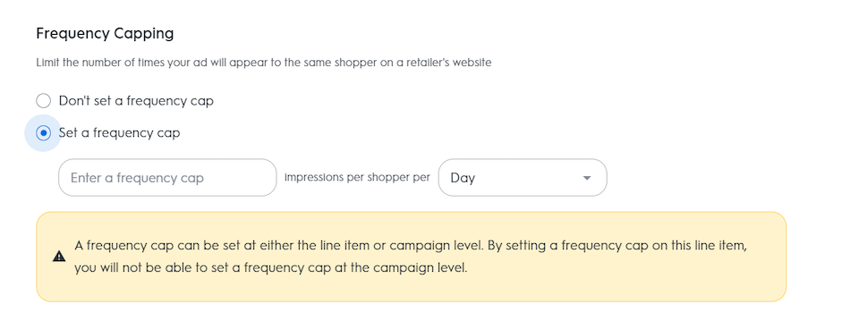 The Frequency Cap can be set at either the line item OR at the campaign level, but it cannot be set on both the line item and campaign level.