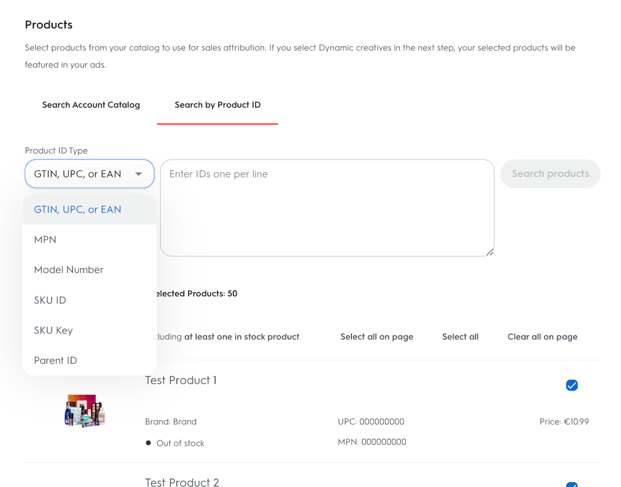 Select the Product ID Type using the drop-down. The following Product IDs Types are supported: GTIN, UPC, or EAN; MPN; Model Number; Product ID; Product Key.