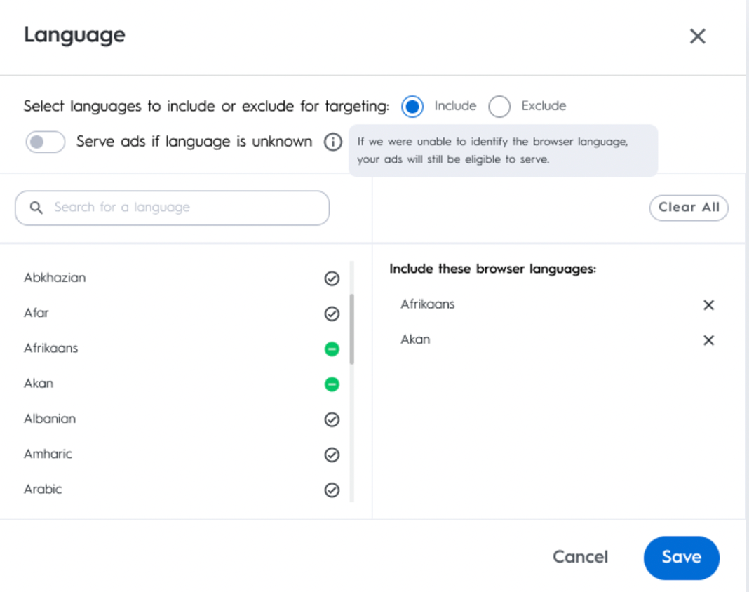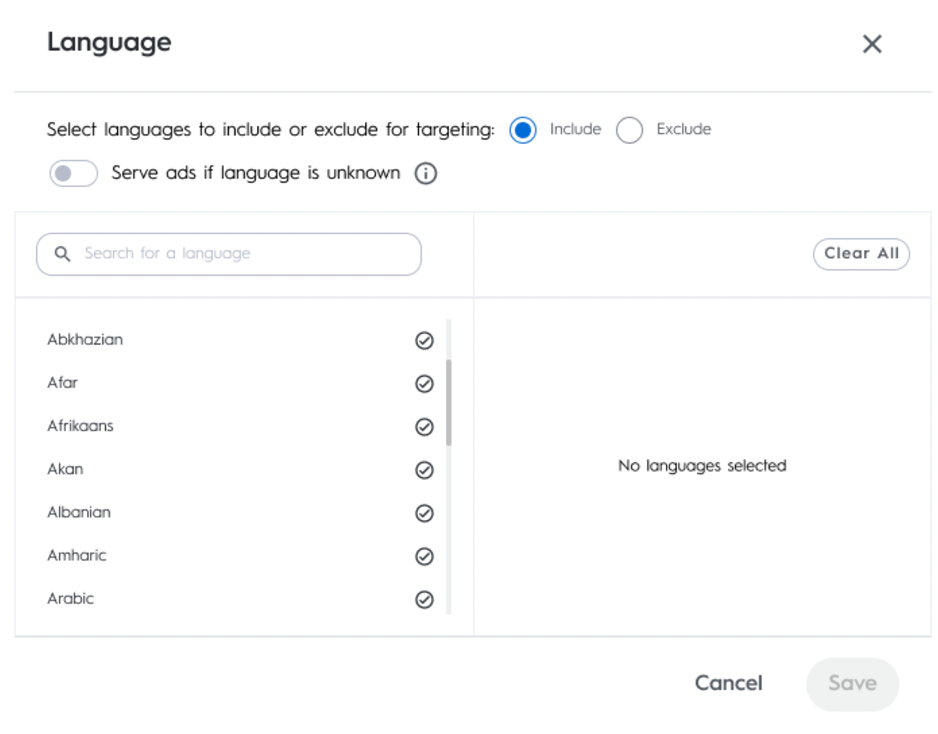 Select the specific user browser language you want your line item to target. You can choose multiple languages to include or exclude. If you need an additional scale for your campaign, you can also choose to allow undetected language to be eligible for ad serving.