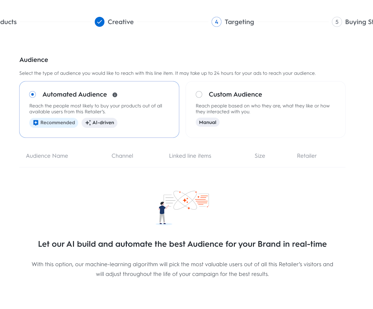 Automated audience: Our machine-learning algorithm will score and pick the most valuable users for your brand out of all the retailer visitors (buyers and non-buyers). This performance-focused audience will be created alongside your line items and start delivering right away.