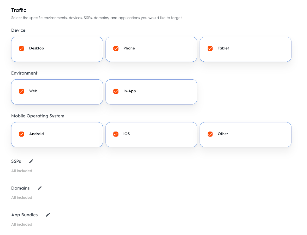 Select specific environments, devices, OSs, Supply-Side Platforms (SSP), domains, and apps you want your line item to target.