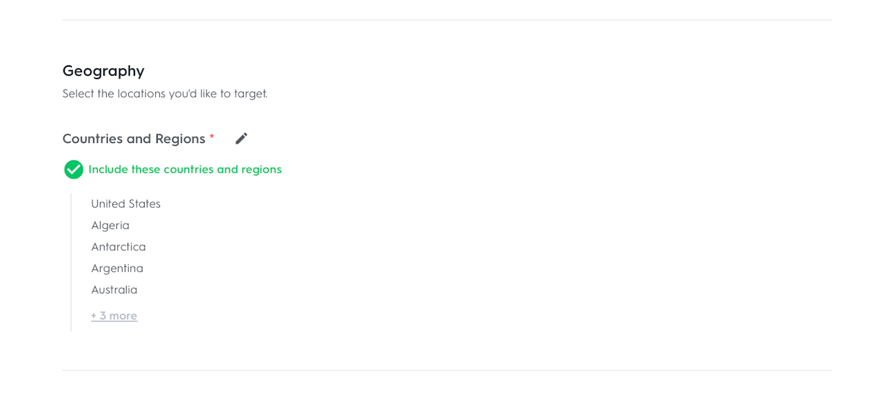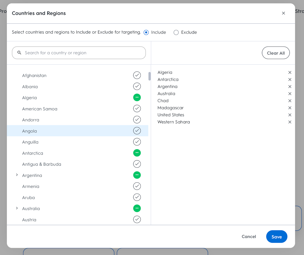 You will then have the option to search specific regions - Countries and Regions to include or exclude for targeting. You can choose if you want to include or exclude specific regions with a selector at the top of the targeting.