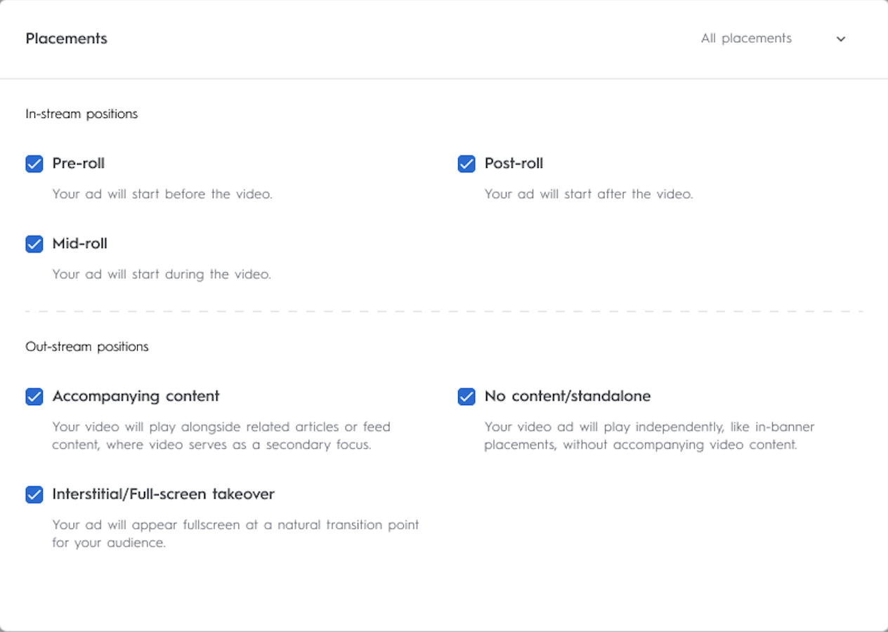 You have the option to select one, multiple, or all of the video placement types available. If no selection is made, the line item will target all placement types. The options include: